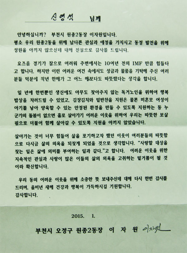 <병원소식> 원종2동주민센터 사랑의 쌀 기증 감사편지