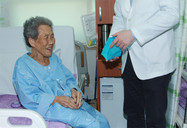 환자들에게 직접 호두와 땅콩을 나눠주고 함께 사진을 찍으며 즐거운 시간을 보냈습니다.